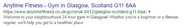Si vous n'avez qu'un seul club de fitness dans une ville, incluez le nom de la ville sur votre page d'accueil et dans votre méta-description comme dans l'exemple ci-dessous.